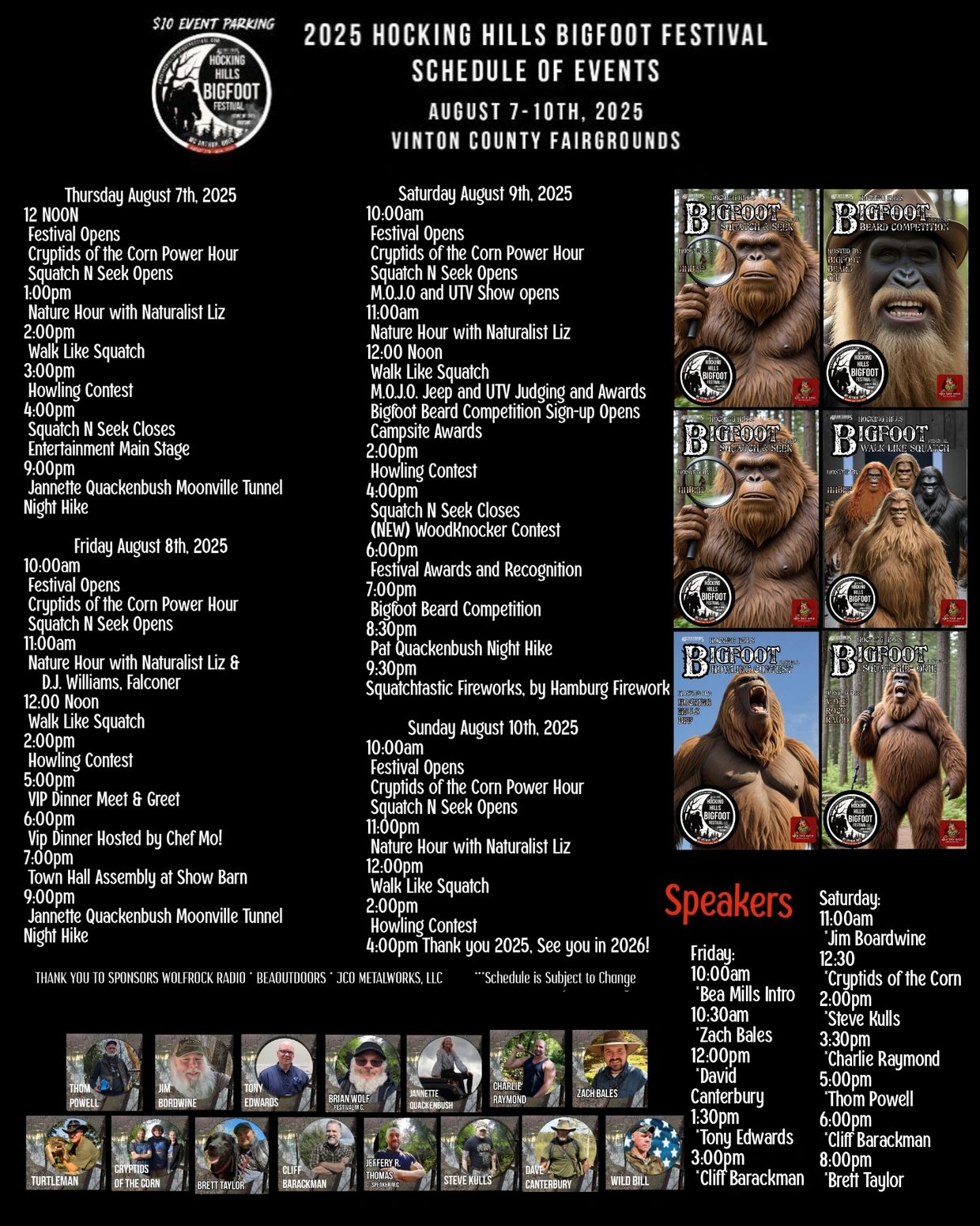 Now with over 150acres, on-site CAMPING, and SO MUCH MORE.... Get your SQUATCH in GEAR for the BIGGEST BIGFOOT YEAR EVER!The 2025 Schedule of Events will be coming out soon!! Stay tuned for Bigfoot Proportional SUPER FUN!